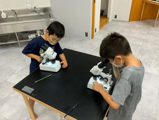 子どもたちは初めて見る顕微鏡に興味津々。使い方を真剣に聞きながら、そのしくみなどを学んでいきます。そして早速それぞれが好きなものを顕微鏡で観察していきます。普段身の回りにでよく目にしているダンボールや箱なども顕微鏡を使ってみて見ると、全く違った様子に見えてきて「おお、すごーい!」や「何これ~」といった新しい世界が見えてきます。