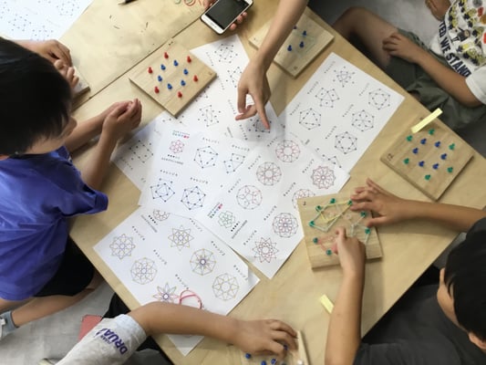 ・算数①では、ごむかけ遊びを通して、線対称や回転対象などの算数を楽しみながら学ぶ。