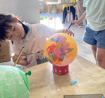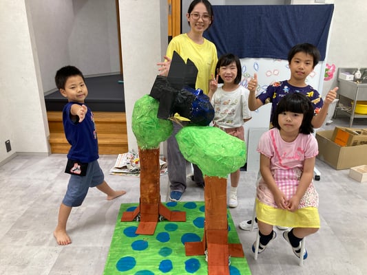 今回は、かなり大物の制作だっため、骨組みは段ボール、肉付けは新聞紙、そしてその上に和紙をみんなで協力して貼って、絵具で色を付けるという協調性がかなり必要で、子どもたちにはとても学びになったのではないでしょうか。