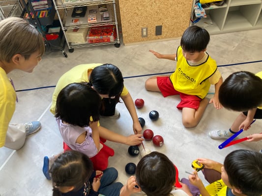 また、おおたかスポーツコミュニティ流山の小林さんをお招きして、パラリンピックの正式種目であるボッチャを実際に体験し、自分たちのゲーム作りに活かすだけでななく、障害のある方もスポーツを楽しむ大会がパラリンピックということを学びました。