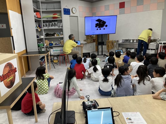 今回の最終Missionは火星探査用(衛星、ローバー、地中探査、サンプルリターン)の自分たちの探査機を作ってもらうのですが、最初は、①地球と火星 ②NASAの火星探査の実際 ③4週間で実施する4つのミッションについて話をしました。特に、②ではNASAで公開しているムービーなどを解説しながら火星探査への興味を引き出し、これから始める③のミッションとの関連性を意識させながら、ミッションの内容や狙いを詳しく伝えました。特に最後に隣の部屋から火星探査ドローンが登場したときには歓声が上がっていました。