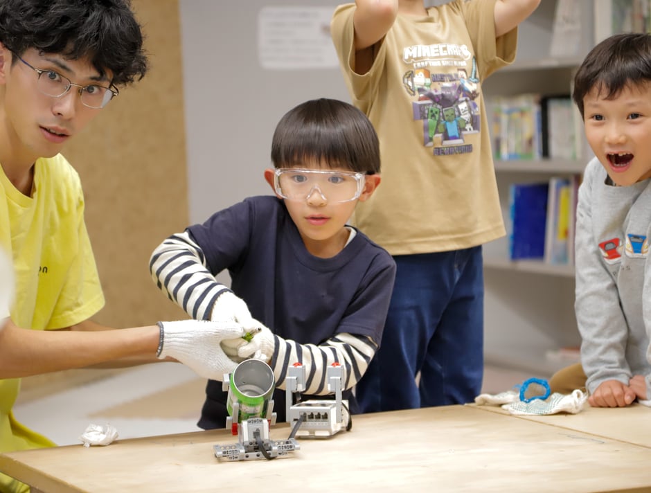 学びのポイントとしては「ロケットの仕組み」「アルコールを燃やすとどうなるのか?」という2つ。まず先日、成功したスペースx社のスペースシップのブースター空中キャッチの映像を紹介しながら、ロケットの仕組みについて考えました。その後は、アルコールを燃料としたロケット発射実験へ。アルコールも液体のときと気体のときでは燃焼の様子が異なること知ったり、アルミ缶と紙コップを使ったアルコールロケット発射実験では、どうしたら同じ燃料の量で遠くまで飛ばすことができるかなどを試行錯誤しました。